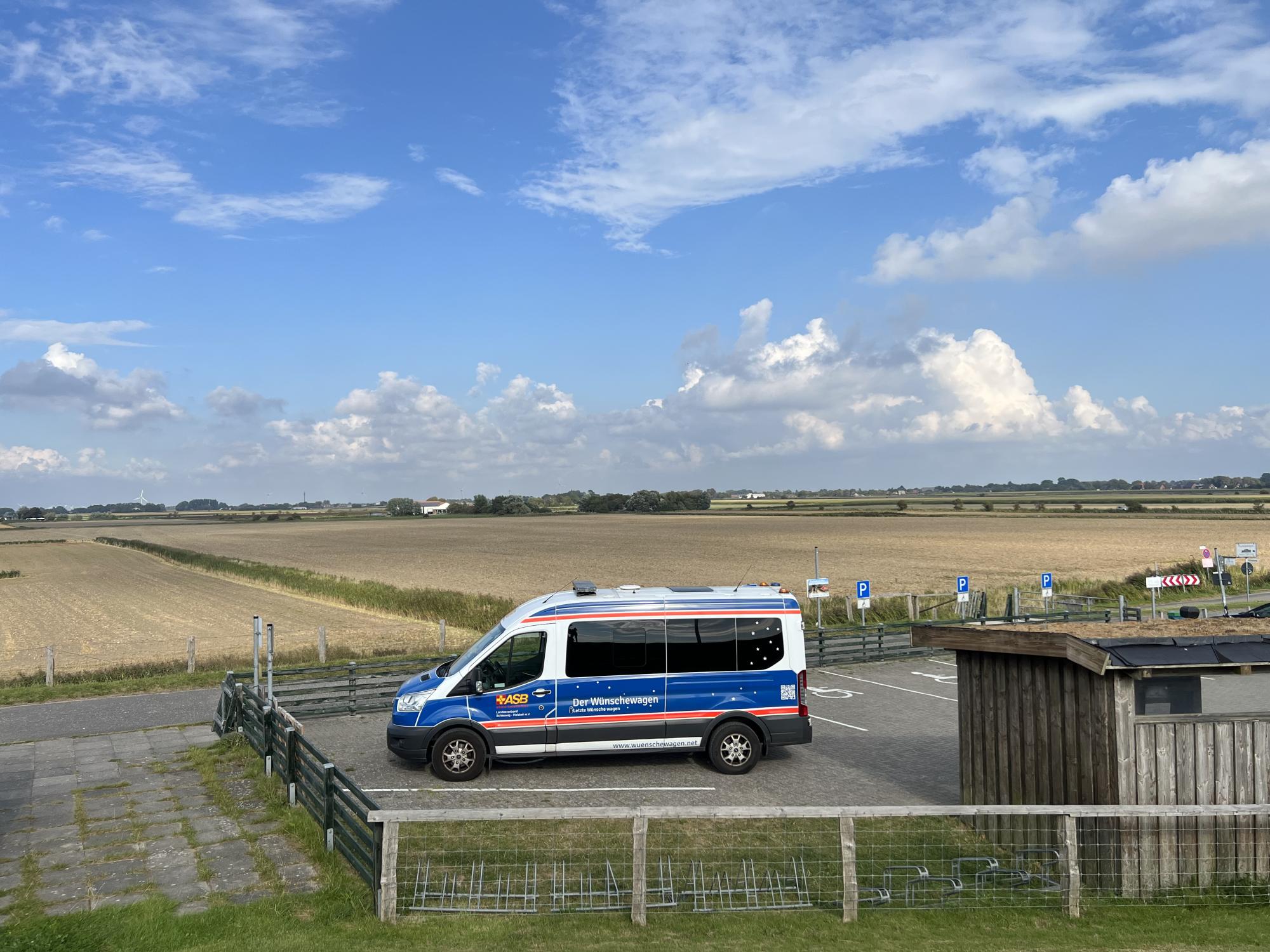 Bei der Fahrt über die Köge erwischte uns ein heftiger Regen, skeptisch beobachteten wir die Wolken. Auf Nordstrand jedoch erwartete uns schönstes Wünschewagenwetter mit wenig Wind, sodass Frerk bei unserem ersten Zwischenstopp am Süderhafen die Aussicht durch die geöffneten Hecktüren genießen konnte.