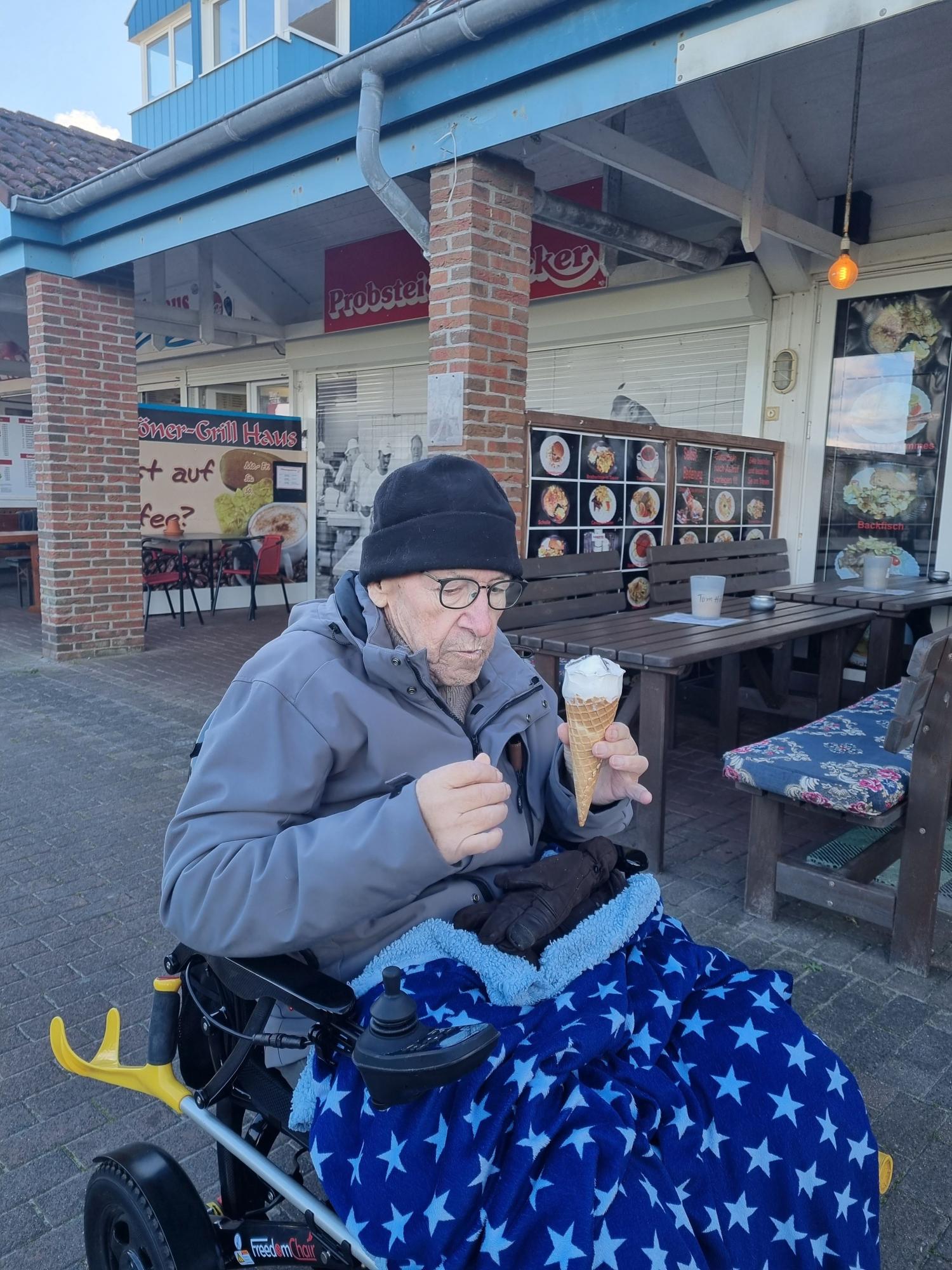 Herr Neitzel konnte mit seinem motorisierten Rollstuhl, den seine Familie für ihn mitgenommen
