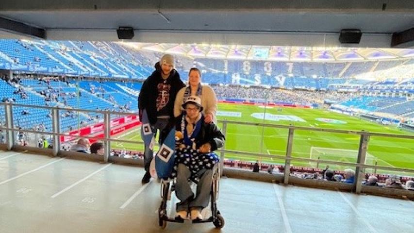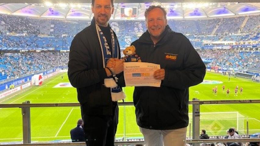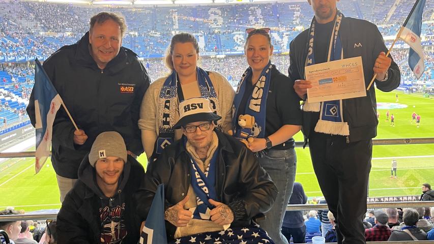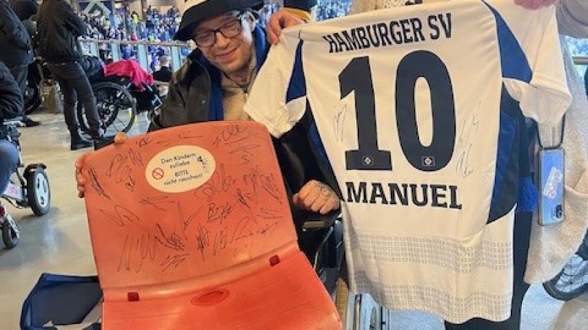 „Wer wird Deutscher Meister, ...“ - Dieses Lied wurde Anfang der 80er-Jahre vielfach in Norddeutschland gesungen. Hier war der HSV noch erstklassig! Manuel Busch aus Itzehoe ist begeisterter HSV-Fan, und als derzeit Tabellenzweiter ist die erste Liga für den HSV wieder erreichbar. Da muss die Mannschaft doch angefeuert werden, und das wurde dann auch gleich in die Tat umgesetzt, so dass Alex und Lars zusätzlich mit Bettina (Ehefrau) und Fabian (Sohn) am Freitagabend ins Volksparkstadion gefahren sind. HSV gegen den SV Elversberg, volles, ausverkauftes Haus, sehr gute Stimmung und die Farben Blau, Weiß und Schwarz dominierten das Stadion. Nach einer Stadionwurst und einem Bier feuerte Manuel seinen HSV lautstark an. Bettina und Fabian unterstützten die Schlachtrufe. Der HSV konnte während der gesamten Spielzeit insgesamt drei Lattentreffer verzeichnen – leider aber kein Tor! Immerhin aber auch kein Gegentor, so dass das Spiel unentschieden mit 0:0 ausging. Die Stimmung trübte jedoch zu keinem Zeitpunkt. Der nette Empfang des HSV-Teams, die freundliche Spende von 500,- Euro durch die HC & S sowie die geschenkte Bettwäsche für weitere Wunschfahrten zum HSV rundeten das Abendspiel bei milden Temperaturen ab. Und dann bekam Manuel noch ein ganz tolles Geschenk: Ein Stadionsitz mit den Autogrammen von allen HSV-Spielern wurde ihm in der Halbzeitpause übergeben. Eine ganz tolle Aktion! Nach dem Schlusspfiff machten wir uns nach einer ausgiebigen Spielanalyse auf den Weg nach Hause, so dass eine tolle Wunschfahrt für unseren begeisterten HSV-Fan endete.