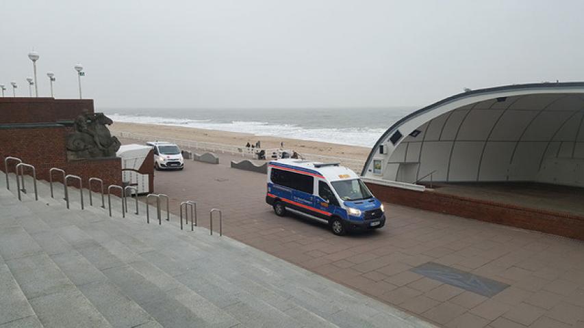 Auf Sylt angekommen, wartete bereits ein weiterer Mannschaftstransporter der DRK Bereitschaft Sylt. Nachdem die „Reisenden Riesen“ am Bahnhof von Westerland bestaunt worden waren, ging die Fahrt in den Kiefernwald in Rantum mit einem kleinen Spaziergang zur Bucht. Am Hafen von Hörnum waren die zwei Seehunde, die sich hier regelmäßig aufhalten, leider nicht da, dafür entschädigte die Weiterfahrt an den Dünen entlang. Unser Fahrgast war überwältigt von ihnen und sagte immer wieder: „Das sind ja richtige Berge!“